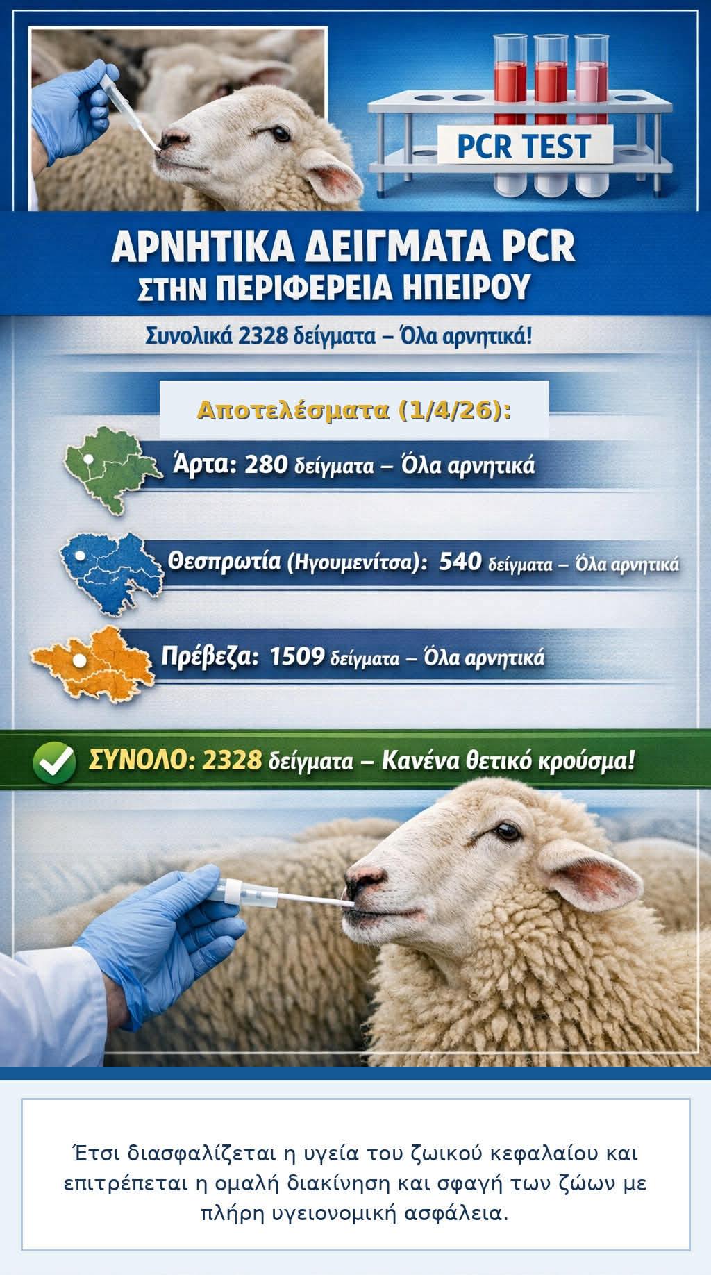 Ειδικότερα, με βάση τα αποτελέσματα της 1ης Απριλίου 2026, πραγματοποιήθηκαν συνολικά 2.328 εργαστηριακοί έλεγχοι (PCR) σε όλη την Περιφέρεια Ηπείρου, χωρίς να εντοπιστεί κανένα θετικό κρούσμα.