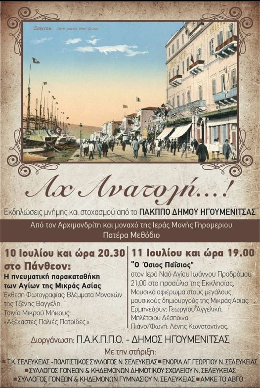 Το ΠΑΚΠΠΟ Δήμου Ηγουμενίτσας και ο Δήμος Ηγουμενίτσας στο πλαίσιο των εκδηλώσεων «Πολιτιστικό Καλοκαίρι 2022» καθώς και των εκδηλώσεων μνήμης για τα  100 χρόνια από την Μικρασιατική Καταστροφήσας προσκαλουν σε ένα διήμερο μνήμης και στοχασμού με την ονομασία «Αχ Ανατολή…!»