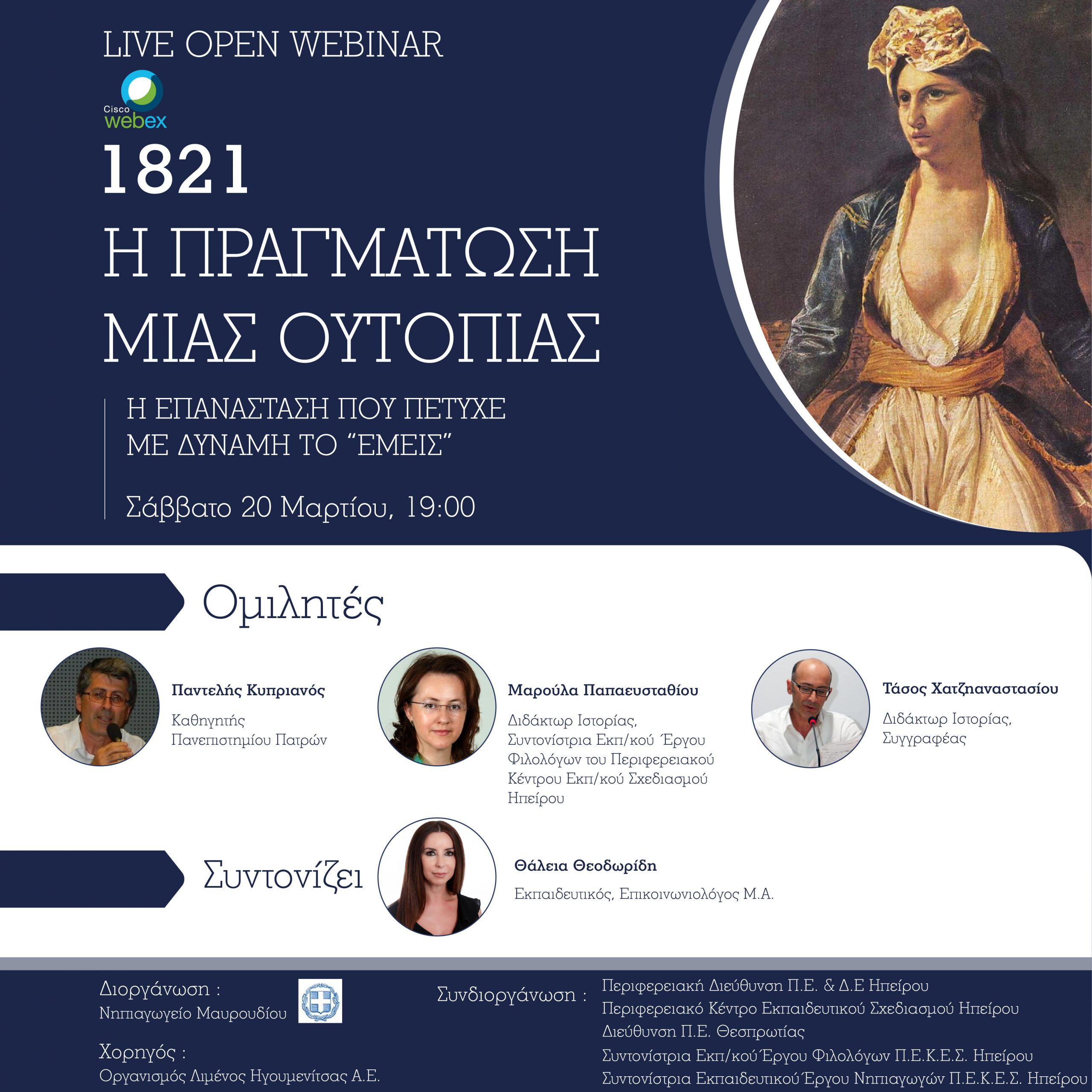 Με τη συμμετοχή διακεκριμένων επιστημόνων από τον χώρο της ακαδημαϊκής κοινότητας, θα διεξαχθεί το Σάββατο 20 Μαρτίου και ώρες 19:00-20:30 live open webinar με θέμα «1821: Η πραγμάτωση μιας ουτοπίας. Η Επανάσταση που πέτυχε με δύναμη το “Εμείς”».