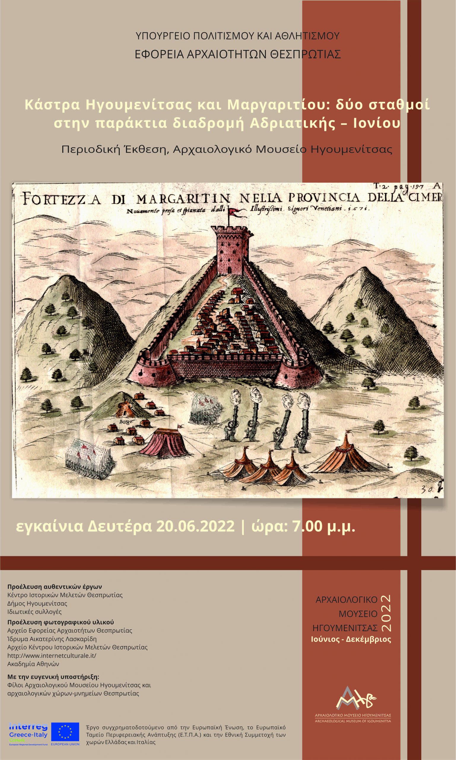 Η Εφορεία Αρχαιοτήτων Θεσπρωτίας σας προσκαλεί  στα εγκαίνια της περιοδικής έκθεσης Κάστρα Ηγουμενίτσας και Μαργαριτίου: δύο σταθμοί στην παράκτια διαδρομή Αδριατικής – Ιονίου τη Δευτέρα 20 Ιουνίου 2022 και ώρα 7:00 μ.μ.  στην αίθουσα «Σωτήρης Δάκαρης» του  Αρχαιολογικού Μουσείο Ηγουμενίτσας.