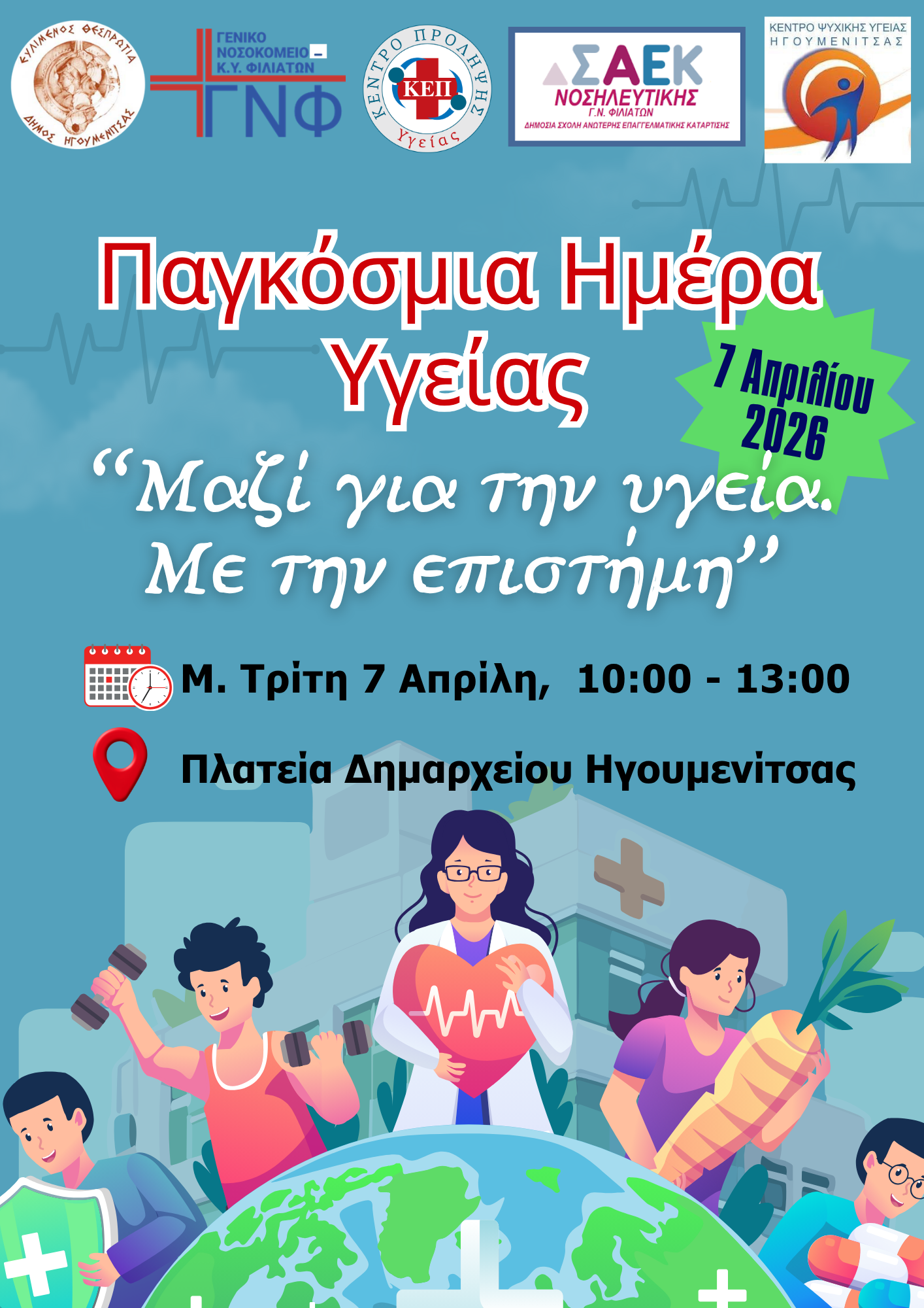Με αφορμή την Παγκόσμια Ημέρα Υγείας και με κεντρικό μήνυμα «Μαζί για την Υγεία. Με την Επιστήμη», το Γενικό Νοσοκομείο-Κ.Υ. Φιλιατών και το ΚΕΠ Υγείας Δήμου Ηγουμενίτσας διοργανώνουν εκδήλωση ενημέρωσης, σε συνεργασία με τη ΣΑΕΚ Φιλιατών και το Κέντρο Ψυχικής Υγείας Ηγουμενίτσας.