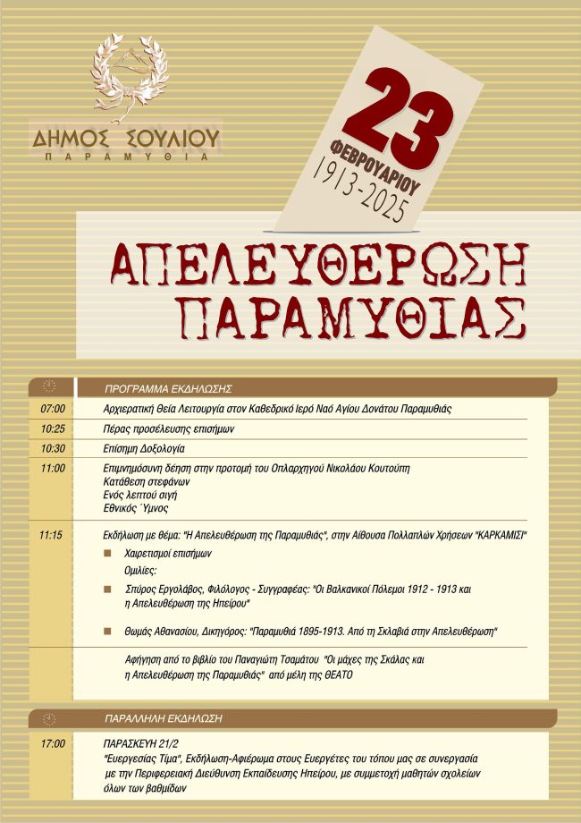 Με σεβασμό στην ιστορία και τιμώντας τους αγώνες του παρελθόντος, ο Δήμος Σουλίου διοργανώνει τις εκδηλώσεις για την 112η επέτειο από την απελευθέρωση της Παραμυθιάς από τον τουρκικό ζυγό, στις 23 Φεβρουαρίου 1913.