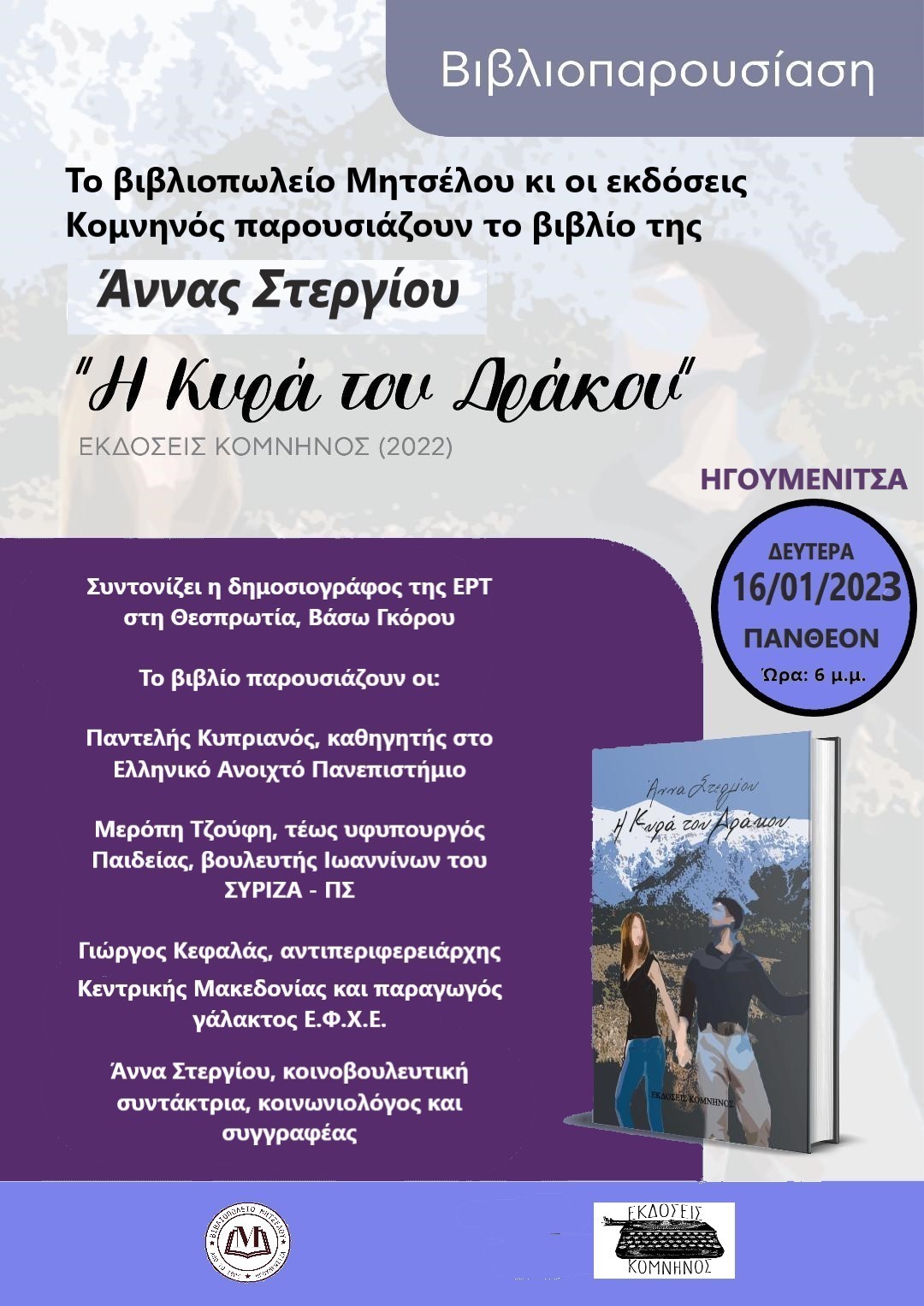Το βιβλίο της συγγραφέως Άννας Στεργίου «Η κυρά του Δράκου» πρόκειται να παρουσιαστεί τη Δευτέρα 16 Ιανουαρίου 2023 στις 6 μ.μ. στο Πολιτιστικό Κέντρο «Πάνθεον». Η εκδήλωση διοργανώνεται από το βιβλιοπωλείο Μητσέλου και τον εκδοτικό οίκο Κομνηνός κι η είσοδος είναι ελεύθερη στο κοινό.