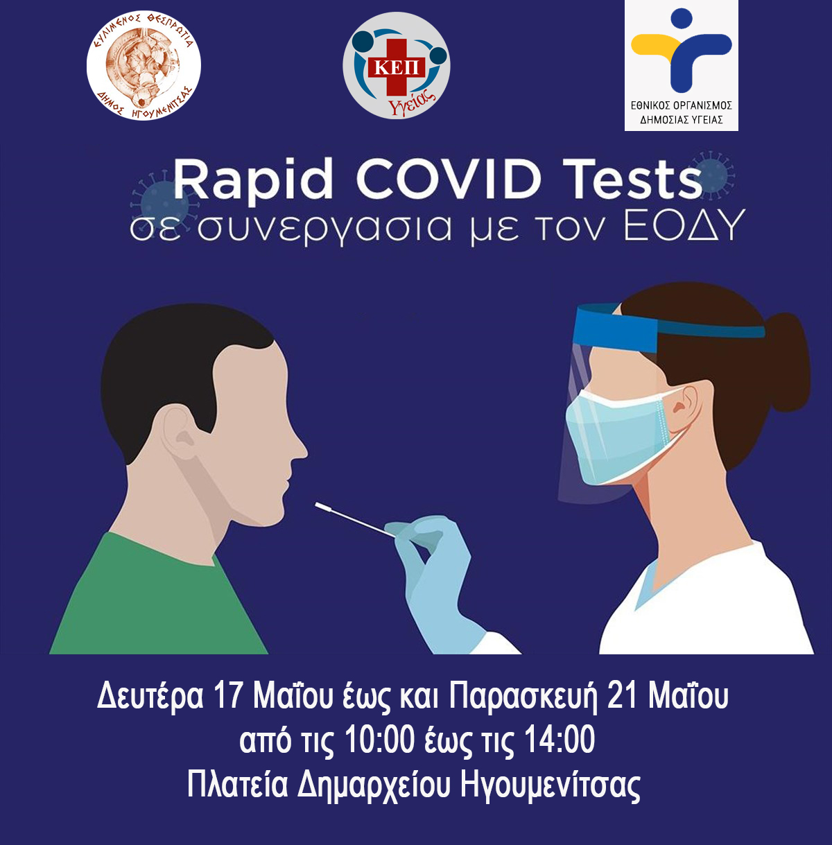 Τα τεστ θα πραγματοποιούνται καθημερινά, από τη Δευτέρα 17 Μαΐου έως και την Παρασκευή 21 Μαΐου, 10:00 έως 14:00, στην πλατεία Δημαρχείου, στην Ηγουμενίτσα.