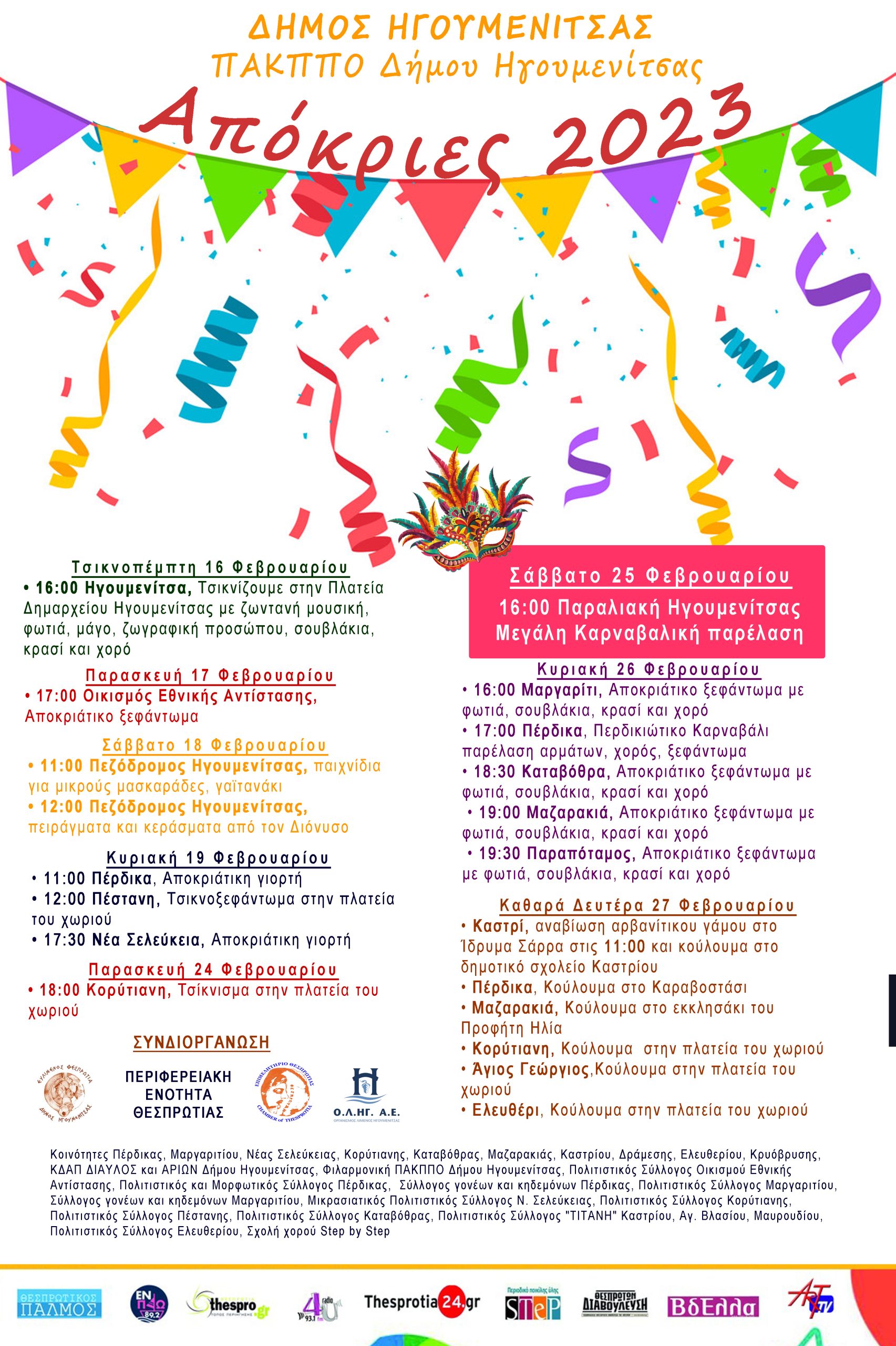 Ο Δήμος Ηγουμενίτσας σας προσκαλεί στις καρναβαλικές εκδηλώσεις που θα λάβουν χώρα στην Ηγουμενίτσα και στις Κοινότητες του Δήμου με κέφι, χορό και αποκριάτικο ξεφάντωμα: