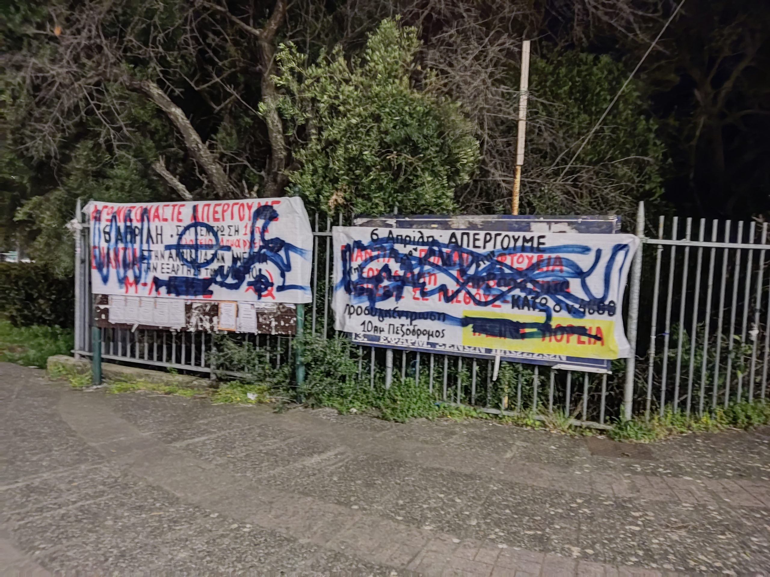 Επίθεση τα πανό της ΤΑΞΙΚΗΣ ΠΟΡΕΙΑΣ και του Μ-Λ ΚΚΕ έξω από τα ΤΕΙ που καλούσαν στην απεργία στις 6 Απρίλη, ενώ κατά καιρούς το ίδιο είχε γίνει σε πανό του ΚΚΕ (μ-λ), της ΑΝΤΑΡΣΥΑ και των Αγωνιστικών Κινήσεων Εκπαιδευτικών.