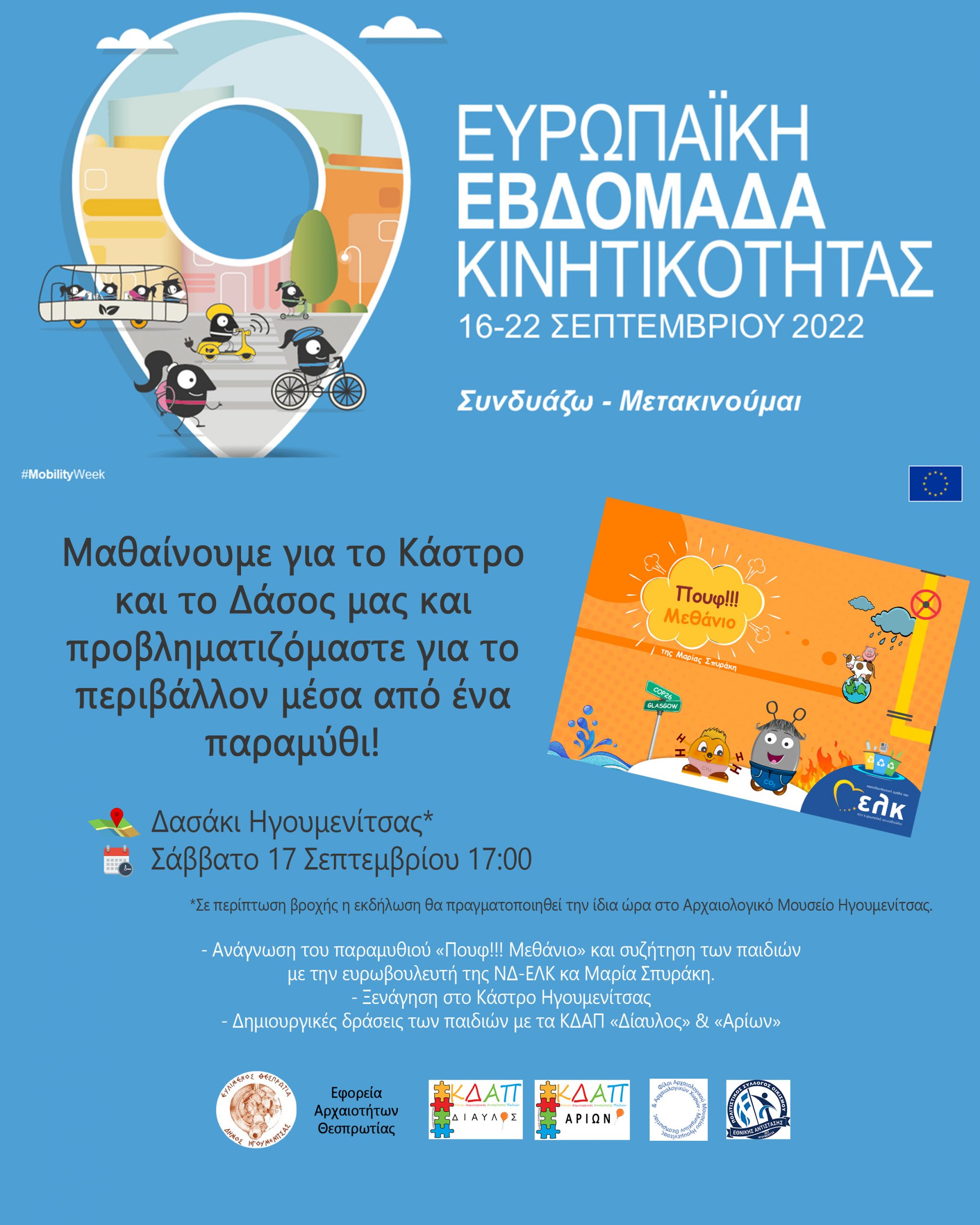 Στο πλαίσιο των εκδηλώσεων για την Ευρωπαϊκή Εβδομάδα Κινητικότητας θα πραγματοποιηθεί η δράση με τίτλο «Μαθαίνουμε για το Κάστροκαι το Δάσος μας και προβληματιζόμαστε για το περιβάλλον μέσα από ένα παραμύθι!» το Σάββατο 17 Σεπτεμβρίου και ώρα 17:00, στο δασάκι της Ηγουμενίτσας.