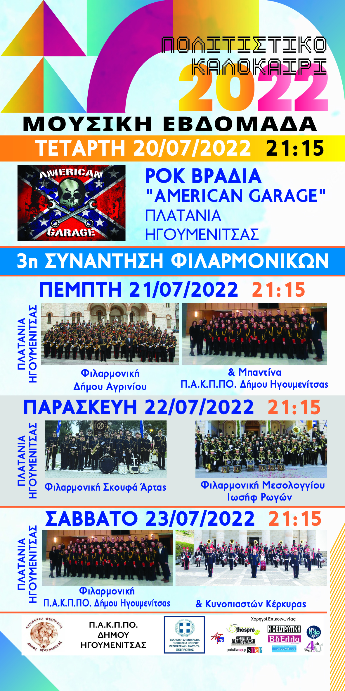 Ο Δήμος Ηγουμενίτσας και το Π.Α.Κ.Π.ΠΟ. του Δήμου Ηγουμενίτσας στο πλαίσιο των εκδηλώσεων  «Πολιτιστικό Καλοκαίρι 2022», σας ενημερώνουν για την έναρξη και τις εκδηλώσεις της «ΜΟΥΣΙΚΗΣ ΕΒΔΟΜΑΔΑΣ», η οποία επιστρέφει δυναμικά: