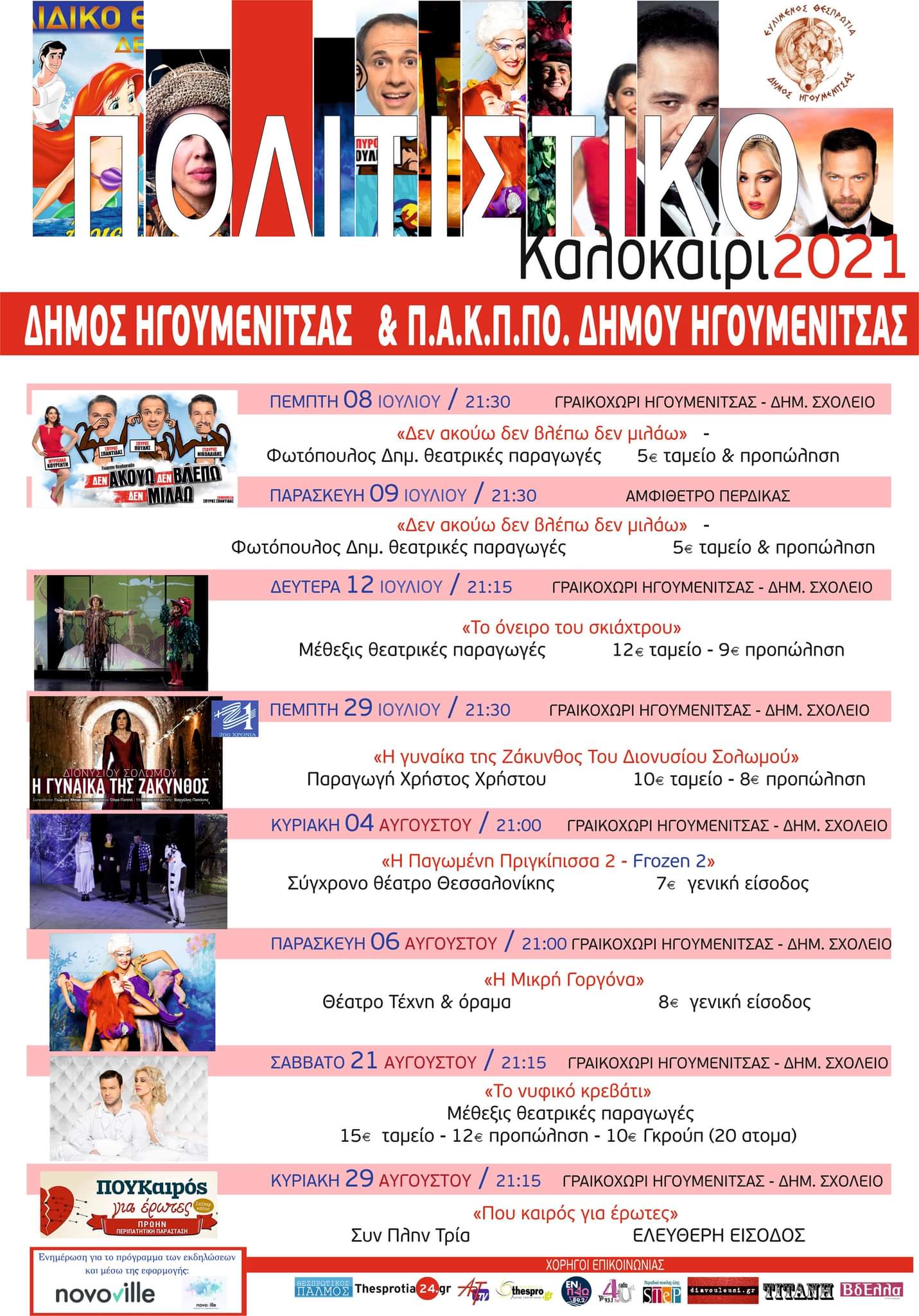 Το Π.ΑΚ.Π.ΠΟ του Δήμου Ηγουμενίτσας σας ενημερώνει την έναρξη των εκδηλώσεων «ΠΟΛΙΤΙΣΤΙΚΟ ΚΑΛΟΚΑΙΡΙ 2021» όπου θα γίνει την Πέμπτη 08-07-2021. Οι εκδηλώσεις για την Ηγουμενίτσα θα γίνουν στο προαύλιο χώρο του Δημοτικού σχολείου Γραικοχωρίου λόγω των εργασιών που γίνονται στο χώρο της πρώην μαθητικής εστίας. Σε όλες τις εκδηλώσεις θα λαμβάνονται όλα τα εκάστοτε προβλεπόμενα μέτρα του ΕΟΔΥ για τον covid 19 . Εφιστούμε την προσοχή σας στις οδηγίες των υπευθύνων των εκδηλώσεων(αποστάσεις, μάσκες, αντισηπτικά κλπ).