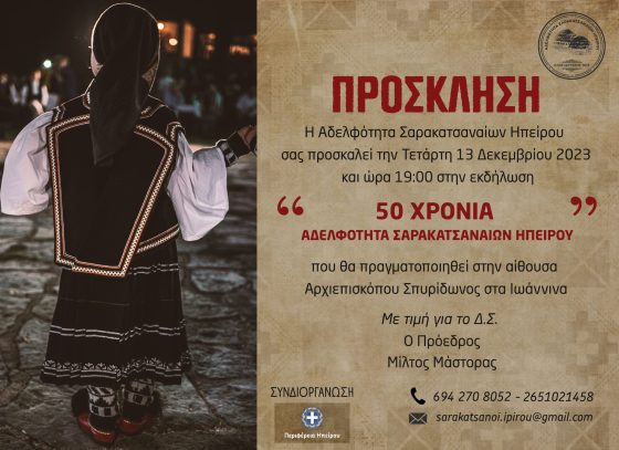 Τα 50 χρόνια συμπληρώνει φέτος η Αδελφότητα Σαρακατσαναίων Ηπείρου και διοργανώνει μια μεγάλη επετειακή εκδήλωση, την Τετάρτη 13 Δεκεμβρίου, στις 19.00, στην αίθουσα Αρχιεπισκόπου Σπυρίδωνος στα Γιάννενα.