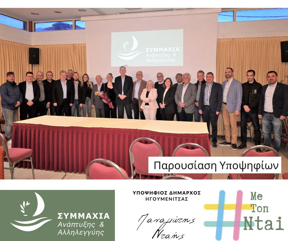 Παρουσιάστηκε η πρώτη ομάδα των υποψηφίων του Συνδυασμού «Συμμαχία Ανάπτυξης και Αλληλεγγύης» του Παναγιώτη Νταή, η οποία αποτελείται από τρεις διακριτές αλλά αλληλοσυμπληρούμενες πηγές προέλευσης: