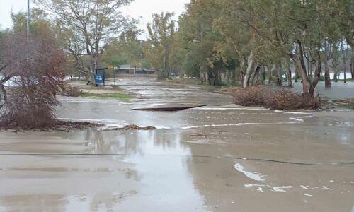 Η κυκλοφορία οχημάτων από το Δρέπανο προς το Μακρυγιάλι είναι αδύνατη, καθώς ο δρόμος βρίσκεται κάτω από τα νερά.