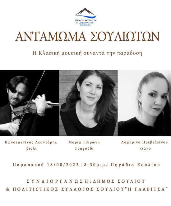 Δ. Ώρα 20.30. «Η Κλασική Μουσική συναντά την Παράδοση» με το γνωστό Ωδείο του κ. Κωστή Λεοντάρη (Ιωάννινα). Θα εκτελεστούν παραδοσιακά ηπειρώτικα τραγούδια ανασυνθεμένα σε λυρική μορφή: βιολί: Κωστής Λεοντάρης, πιάνο: Λαμπρίνα Πρεβεζάνου, τραγούδι: Μαρία Τσιρώνη – σοπράνο Εθνικής Λυρικής Σκηνής.