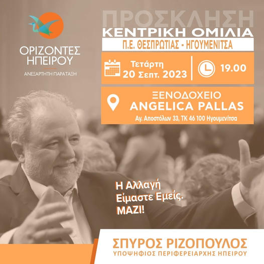 Την Τετάρτη 20 Σεπτεμβρίου, στις 19:00 θα πραγματοποιηθεί η κεντρική ομιλία του Σπύρου Ριζόπουλου στην Ηγουμενίτσα, στο ξενοδοχείο Angelica Pallas.