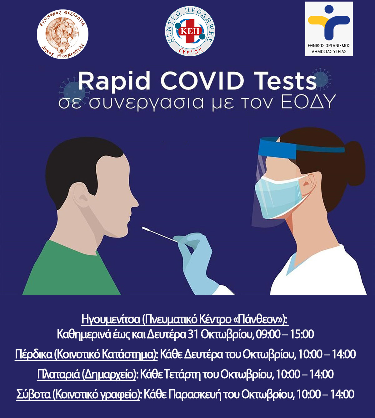 Ο Δήμος Ηγουμενίτσας σε συνεργασία με τον Εθνικό Οργανισμό Δημόσιας Υγείας (ΕΟΔΥ) συνεχίζουν τους μαζικούς δωρεάν ελέγχους ταχείας ανίχνευσης αντιγόνου (rapidtest) Covid-19,στο πλαίσιο των μέτρων πρόληψης και προστασίας της δημόσιας υγείας.