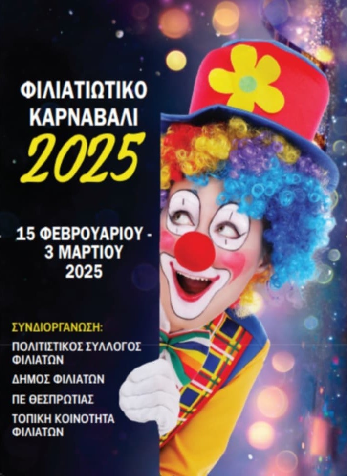 Ο Δήμος Φιλιατών και ο Πολιτιστικός Σύλλογος Φιλιατών κηρύσσουν την έναρξη της προετοιμασίας των εκδηλώσεων για το «Φιλιατιώτικο Καρναβάλι 2025» και σας προσκαλούν στο μακροβιότερο καρναβάλι του νομού Θεσπρωτίας, που φέτος συμπληρώνει 66 χρόνια!