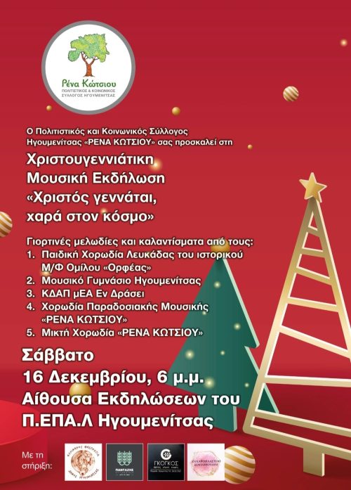 Αύριο στις 6 μ.μ. στην αίθουσα του Π.ΕΠΑ.Λ. Ηγουμενίτσας θα πραγματοποιηθεί Χριστουγεννιάτικη Μουσική Εκδήλωση “Χριστός γεννάται, χαρά στον κόσμο” που διοργανώνει ο Σύλλογος “Ρένα Κώτσιου”.