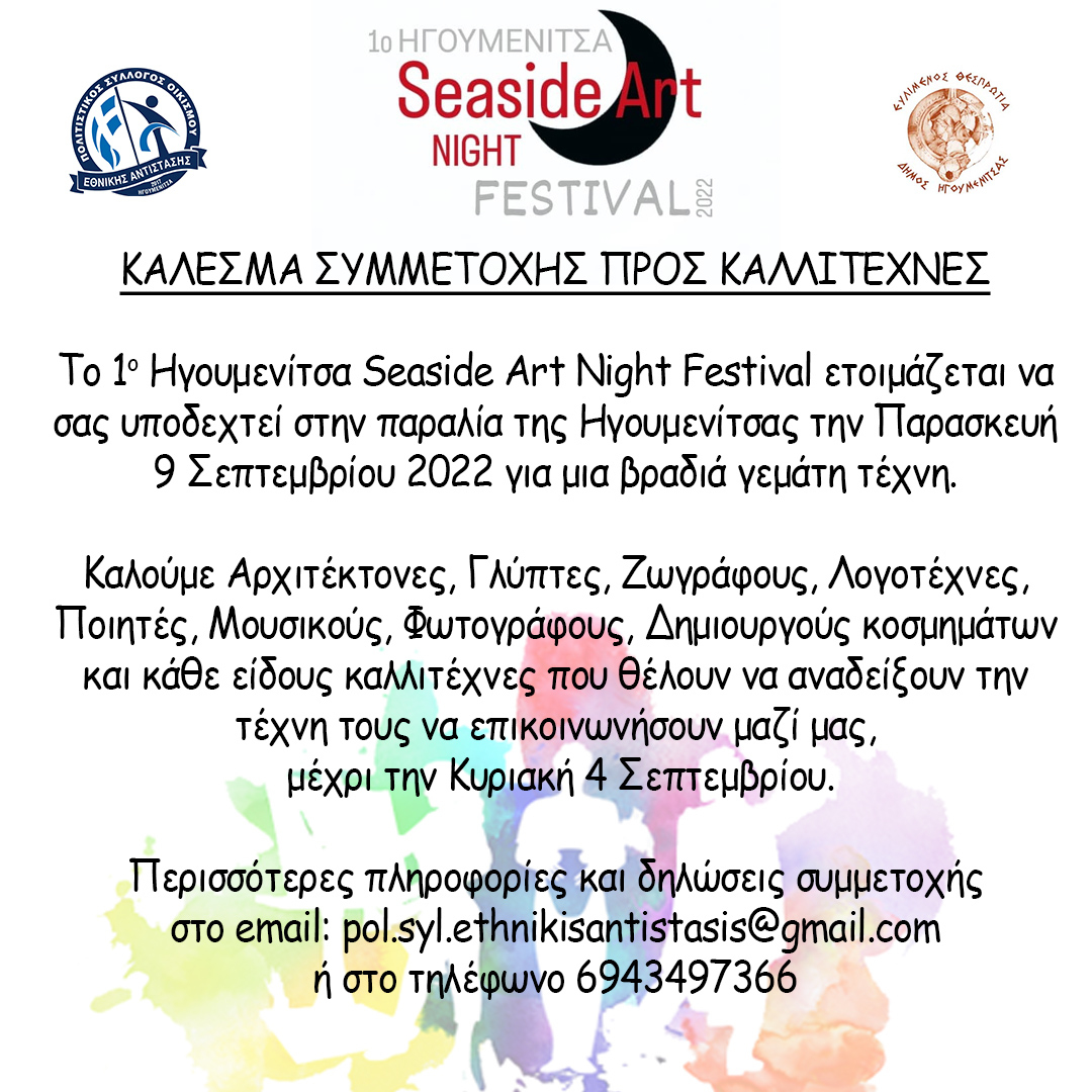 OΠολιτιστικός Σύλλογος Οικισμού Εθνικής Αντίστασης Ηγουμενίτσας και ο Δήμος Ηγουμενίτσας διοργανώνουν τo1oΗγουμενίτσα SeasideArtNightFestival, στην παραλία της Ηγουμενίτσας την Παρασκευή 9 Σεπτεμβρίου 2022.