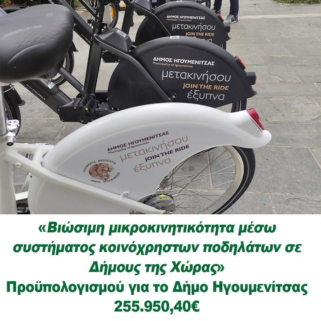 Ο Δήμος Ηγουμενίτσας εντάχθηκε στο Επιχειρησιακό Πρόγραμμα «Υποδομές Μεταφορών, Περιβάλλον και Αειφόρος Ανάπτυξη 2014-2020» για την υλοποίηση τηςΠράξης «Βιώσιμη μικροκινητικότητα μέσω συστήματος κοινόχρηστων ποδηλάτων σε Δήμους της Χώρας», προϋπολογισμού 255.950,40€. (ΑΔΑ: Ω2ΟΡ46ΜΤΛΡ-ΤΛΛ)