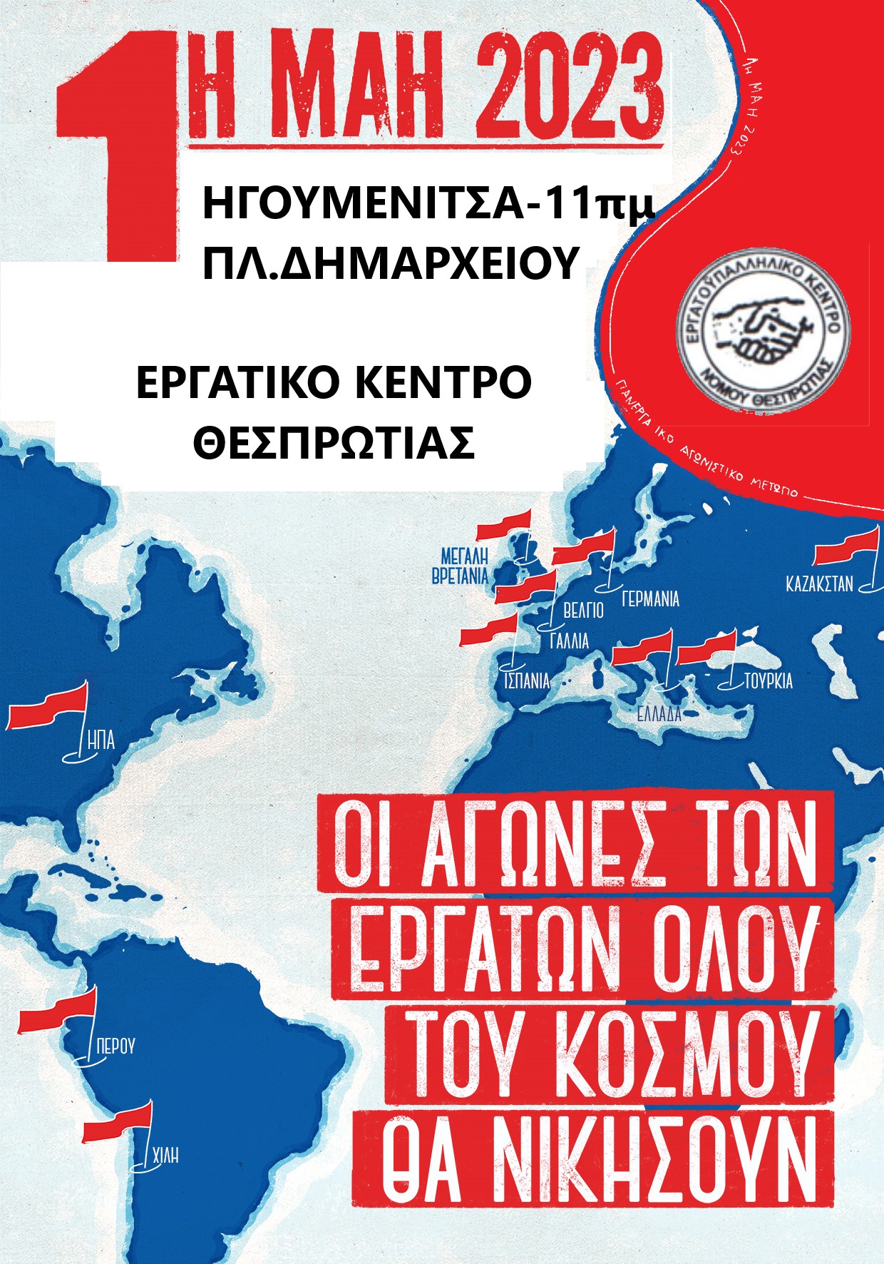 Απεργιακή συγκέντρωση για τον εορτασμό της εργατικής πρωτομαγιάς οργανώνει το Εργατικό Κέντρο Θεσπρωτίας τη Δευτέρα 1η Μαΐου στις 11 το πρωί στην πλατεία δημαρχείου.